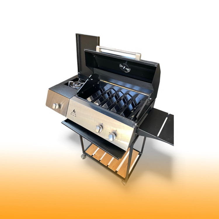 دارای ۶ عدد ناودانی استیل و شلف گریل برای پخت غذای رژیمی و میز کار ۳۰ سانتی فلزی قابل استفاده در هر طرف باربیکیو