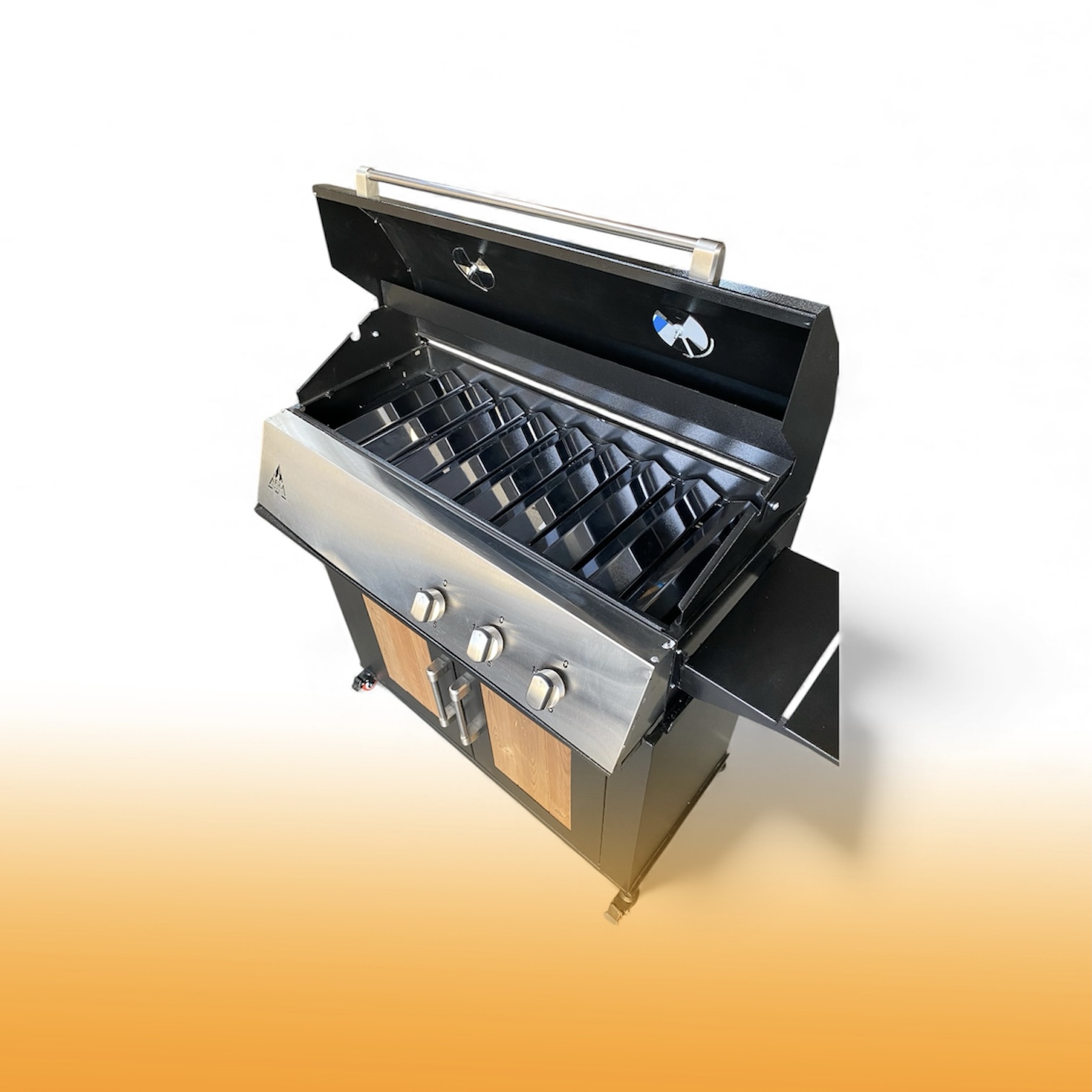 دارای ۹ عدد ناودانی استیل و شلف گریل برای پخت غذای رژیمی و میز کار ۳۰ سانتی فلزی قابل استفاده در هر طرف باربیکیو